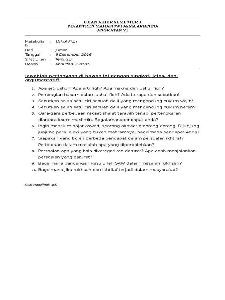 Ushul fiqh i jur/ prodi / smt / unit : Coba anda jelaskan pengertian ushul fiqh secara bahasa dan istilah dengan lengkap dan jelas.? 08.08.2017 · latihan soal uambn fikih ma tahun 2018/2019 yang bersumber dari soal uambn 2017, 2016 dan 2015. Minggu, 12 maret 2017 prediksi un tryout un ujian nasional. Sebagai persiapan menghadapi pelaksanaan uambn madrasah aliyah (ma) 2018/2019 admin berbagi soal latihan uambn untuk madrasah aliyah (ma).